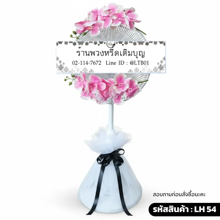 พวงหรีดพัดลม 16นิ้ว,18นิ้ว คอสไลด์ประดับดอกไม้ประดิษฐ์(ฟาแลน)เกรดนำเข้าจากต่างประเทศ ฐานพัดลมประดับด้วยผ้าโปร่งสีชมพูพร้อมติดริบบิ้้นเพื่อความสวยหรูที่ลงตัว