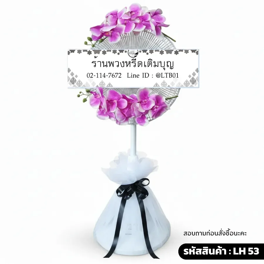 พวงหรีดพัดลม 16นิ้ว,18นิ้ว สไลด์ประดับดอกไม้ประดิษฐ์(ดอกฟาแลน)เกรดนำเข้าจากต่างประเทศ ฐานพัดลมประดับด้วยผ้าโปร่งสีดำพร้อมติดริบบิ้นเพื่อความสวยงาม