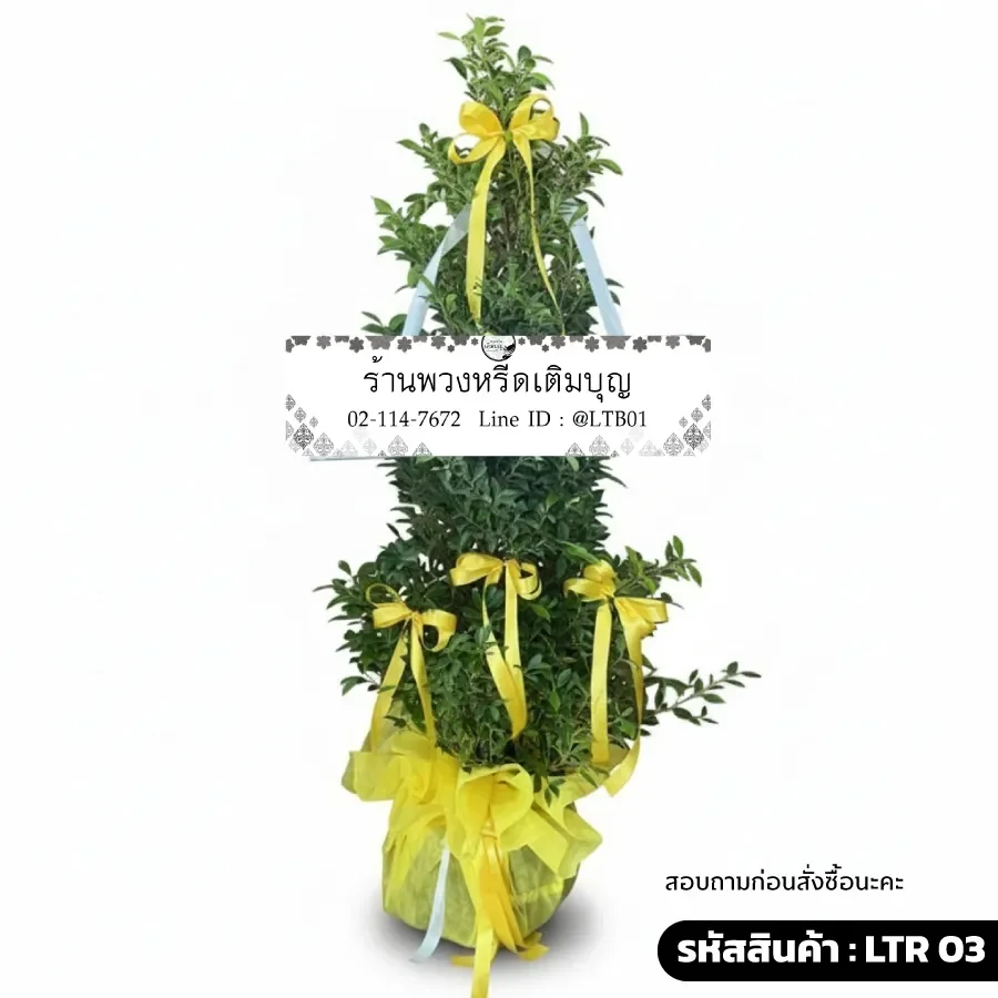 "พวงหรีดต้นไม้ แสงธรรม" ถูกออกแบบมาเพื่อสื่อความหมายถึงแสงสว่างแห่งธรรมะและความอาลัยที่อบอุ่น เลือกใช้โทน "สีเหลือง" ซึ่งเป็นสีแห่งพุทธศาสนาและการหลุดพ้น ตกแต่งริบบิ้นสีเหลืองทองสวยงามตัดกับใบสีเขียวเข้มของต้นไทรเกาหลีสูง 120 ซม. อย่างลงตัว