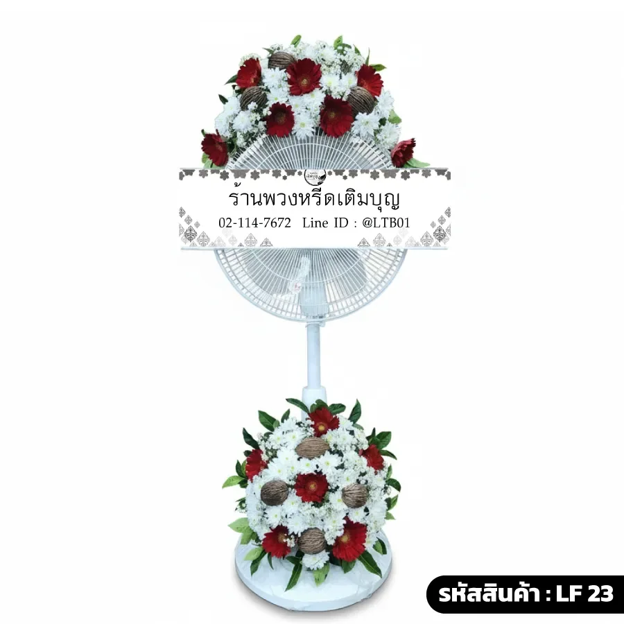 พวงหรีดพัดลมดอกไม้สด "แดงธรรม" (รหัส LF23)