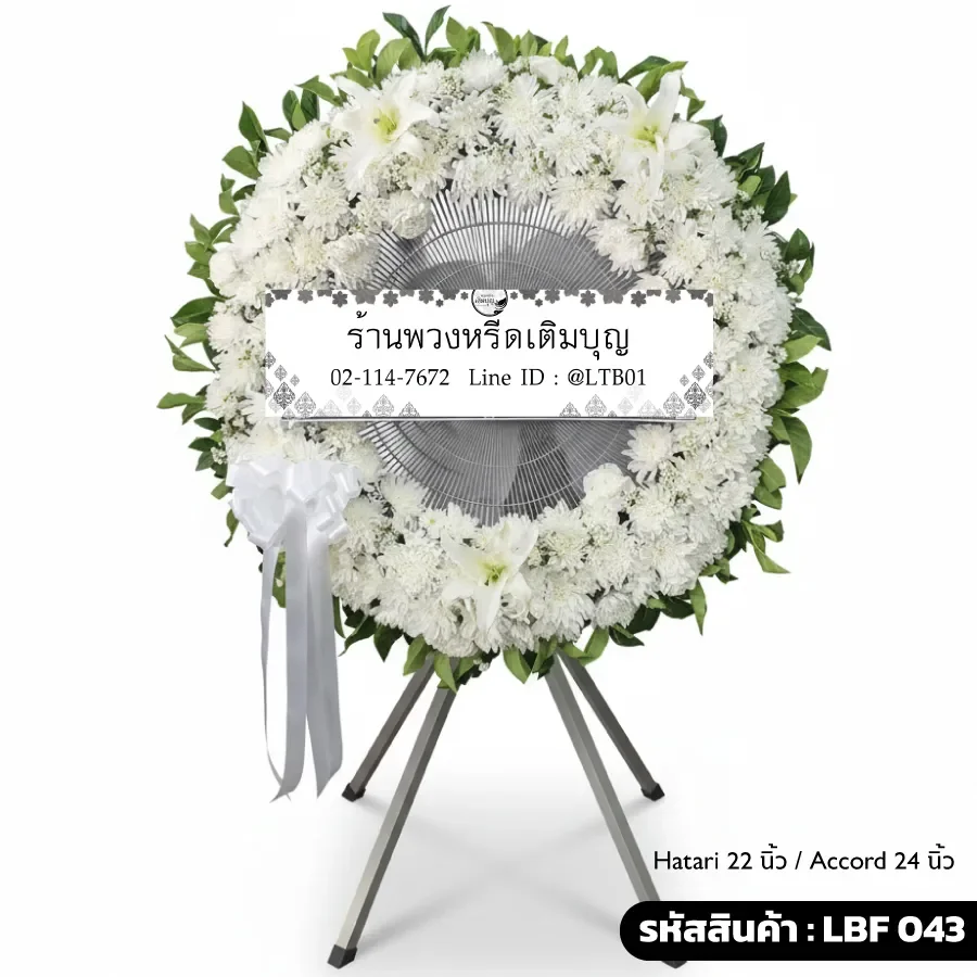 วัสดุ/ดอกไม้: ดอกไม้สด (ลิลลี่ขาว, เบญจมาศขาว, ดอกมัม) + ริบบิ้นขาว