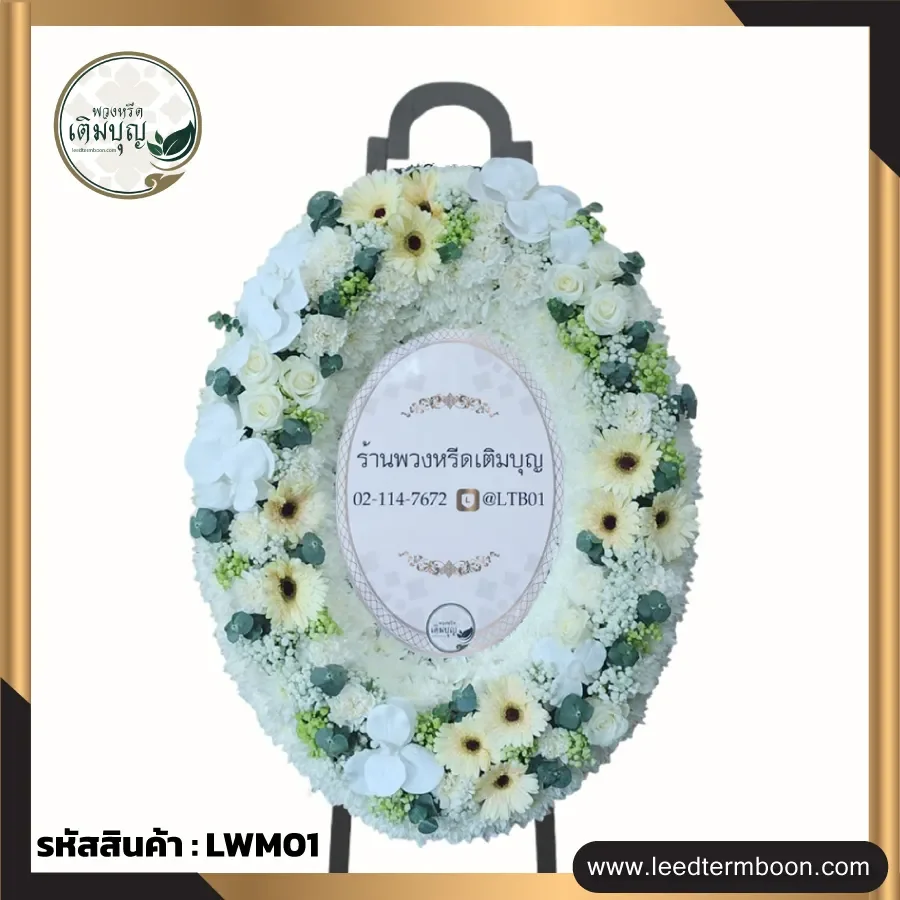 พวงหรีดเติมบุญ LWM01 คือ พวงหรีดดอกไม้สด ดีไซน์โมเดิร์น รูปทรงวงรี ขนาดประมาณ 60 x 80 ซม. โดดเด่นด้วย:
