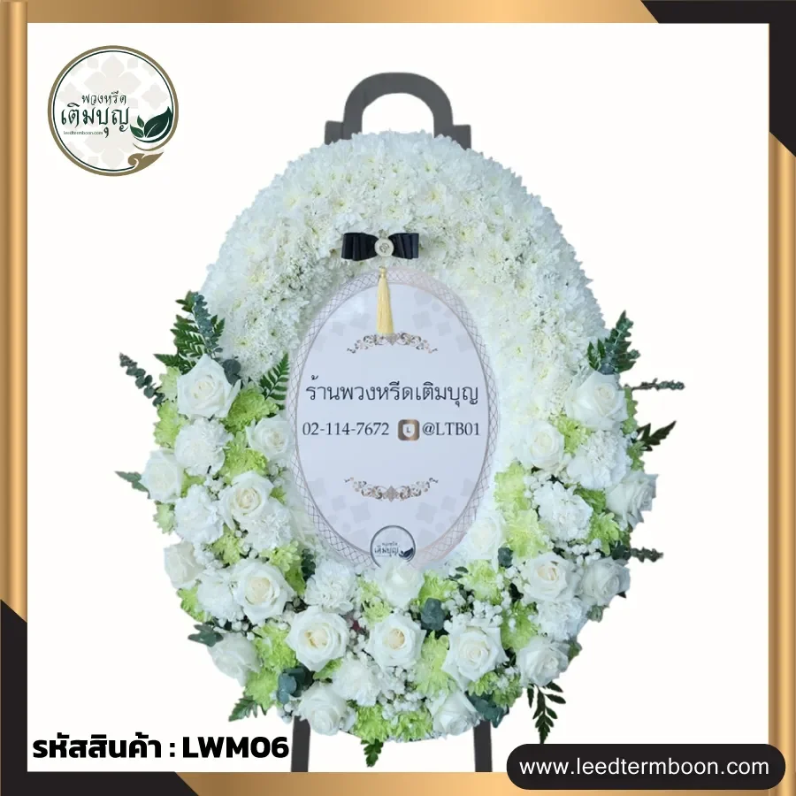 พวงหรีดเติมบุญ LWM06 คือ พวงหรีดดอกไม้สด ดีไซน์โมเดิร์น รูปทรงวงรี ขนาดประมาณ 60 x 80 ซม. โดดเด่นด้วย: