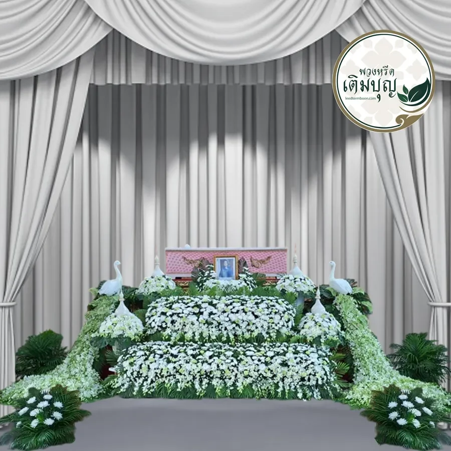 จัดดอกไม้งานศพ ราคา 37,000 บาท โดยมีการจัดดอกไม้หน้าหีบ เป็นลักษณะสวนดอกไม้ 2 ชั้น พร้อม พุ่มไม้ 4 กอ หงษ์1คู่ และ แสตนด์พนม 2 คู่ จัดดอกไม้กรอบรูป ประกอบไปด้วยโทนสี ขาว เขียว